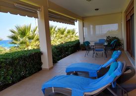 Tholos Bay Suites is a large villa separated into four comfortable 2-bedroom suites. Three of which are available for holiday rental; two are 90 sq. m. and one is 75 sq. m. Each has its own 50 sq. m. balcony/veranda and its own separate entrance.
